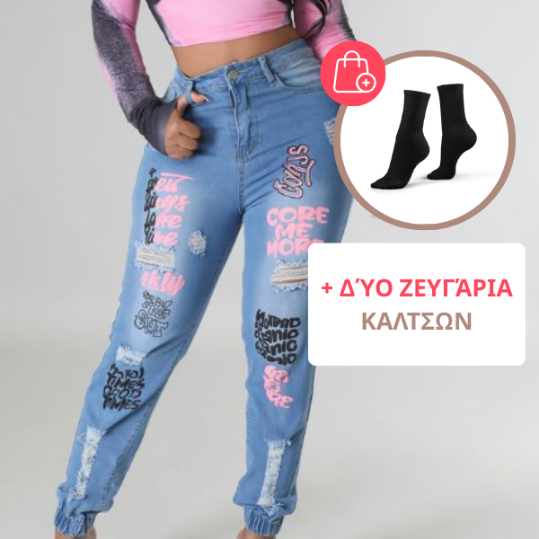 Κομψό τζιν με στάμπες που συνδυάζει άνεση και μοντέρνο σχεδιασμό.