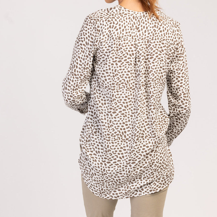 Αυτή η γυναικεία μπλούζα με μακριά μανίκια και εκλεπτυσμένο ασπρόμαυρο σχέδιο συνδυάζει κομψότητα και άνεση. Κατασκευασμένη από απαλή βισκόζη, εφαρμόζει όμορφα και αναπνέει, προσφέροντας μια άνετη αίσθηση όλη μέρα.